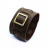 Оливково-коричневый кожаный браслет в винтажном стиле. Выполнен в виде манжеты с установленной рамкой золотистого цвета с потертостями в стиле стимпанк. Фурнитура в цвете античная бронза, застегивается на кнопки в трех положениях обхвата кисти 16-17,5-18,5 см.