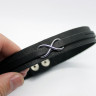 Кожаный чокер средней ширины около 18 мм. Украшен пришитой полосой кожи с бейлом в виде знака бесконечности (сплав с покрытием). Чокер застегивается на кнопки и длина регулируется в пределах около 2х сантиметров. Для заказа измерьте шею в нужном месте, добавьте к результату 0,7 см, выберите правильный размер из списка артикулов.