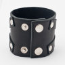 Черный кожаный кафф с декоративными кожаными полосами на широкой платформе. Двухслойная платформа застегивается на две курточные кнопки и имеет ширину 6 см. Декоративные полосы образуют иксообразный узор, прошит по периметру черной нитью. Изготовлен из натуральной кожи в Украине.