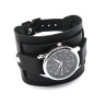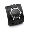 Наручные часы Frant с чёрным циферблатом и контрастными белыми цифрами. Установлены на широкий кожаный браслет с двумя застежками пряжками. Оснащены японским механизмом с тремя стрелками.