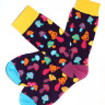 Фиолетовые с жёлтыми и голубыми вставками весёлые носочки с принтом разных грибочков.