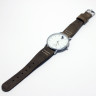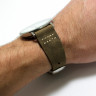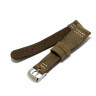 Винтажный нестандартный кожаный ремень для часов с креплением 20 мм. Изготовлен из цельной светло-коричневой кожи с оттенком хаки в один слой. Имеет зауженную почти симметричную форму по длине, прошит светлой контрастной нитью.