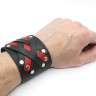 Широкий чёрный кожаный браслет Jurba из новой коллекции "Червоне та Журба". Манжета браслета украшена чёрными и красными полосами которые образуют узор напоминающий древнеславянский символ земного огня, а также индуистский символ солнца.