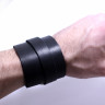 Стильний широкий чорний шкіряний браслет з великою фігурною пряжкою у вінтажному стилі. Складається з прямокутної манжети і вузької смуги з отворами, яка обертається навколо руки двічі за типом напульсників. Поєднання грубих ліній дизайну браслета з плавними лініями фурнітури створюють збалансовану композицію прикраси на руці, яка однозначно приверне увагу.