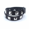 Довгий шкіряний браслет на два оберта з встановленими залізними пірамідами на заклепках. Застібається на стандартну пряжку з регулюванням від 16 до 19 см. Якщо у вас рука більше або менше - повідомте про це в коментарі або менеджеру магазину.